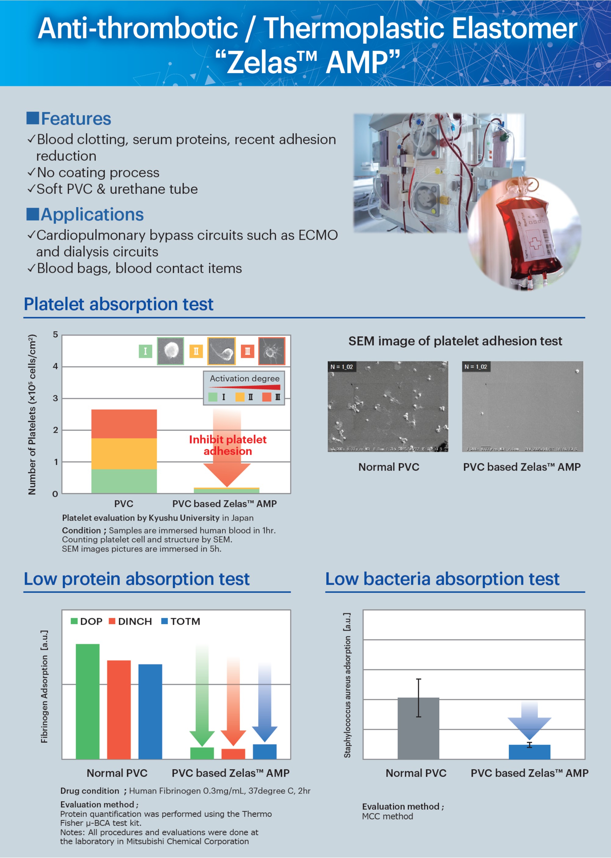 三菱化学株式会社多年来在医用级复合树脂ZELAS™ AMP方面积累了先进的配方和复合技术,并扩展了其医用材料的全球供应体系。ZELAS™ AMP关键聚合物是三菱化学开发的一种两亲性聚合物,它结合了源自其亲水结构的血液相容性以及源自其疏水结构的基材亲和性。通过将ZELAS™ AMP关键聚合物添加到用作医疗器械基础材料的树脂(例如聚氯乙烯、聚氨酯和工程塑料)中,可以为基材赋予抗血栓性能、低蛋白质吸附性和低细菌粘附性。