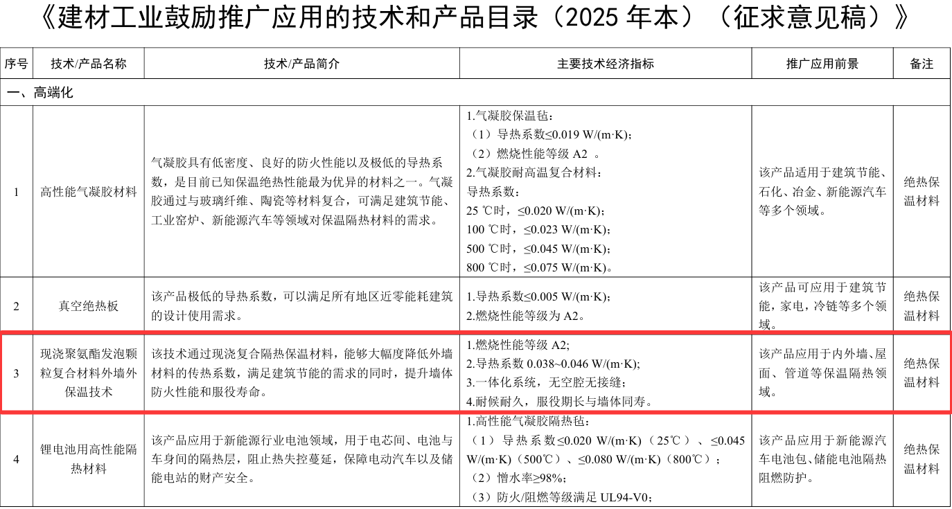 2025年10月16日,工业和信息化部公布《建材工业鼓励推广应用的技术和产品目录(2025年本)》,目录按高端化、智能化、绿色化三大转型方向,收录67项技术和产品,其中,现浇聚氨酯发泡颗粒复合材料外墙外保温技术作为高端化技术被列入其中。