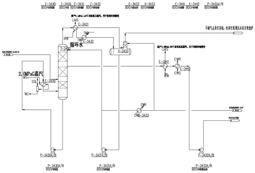 目前,BDO的主要的生产方法有:炔醛法、顺酐法、丁二烯法和环氧丙烷法。目前国内BDO生产企业基本采用炔醛法和顺酐法。而不管用什么方法生产BDO,都会无法避免的生成各种缩醛类物质,炔醛法会产生羟基丁醛和乙缩醛,顺酐酯化加氢法会产生缩醛2‑(4‑羟基丁氧基)四氢呋喃(HBTHF),这些都是难以从BDO产品中分离的杂质,特别是HBTHF和BDO形成共沸,普通的精馏难以从BDO产品中分离出HBTHF,往往只能牺牲掉这部分共沸物中的BDO,以保证BDO主产品的纯度合格。