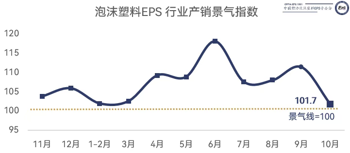 2025年10月份,全国泡沫塑料EPS行业产销景气指数为101.7,环比下降9.6点,同比下降6点。行业产销整体活跃水平位于景气区间。