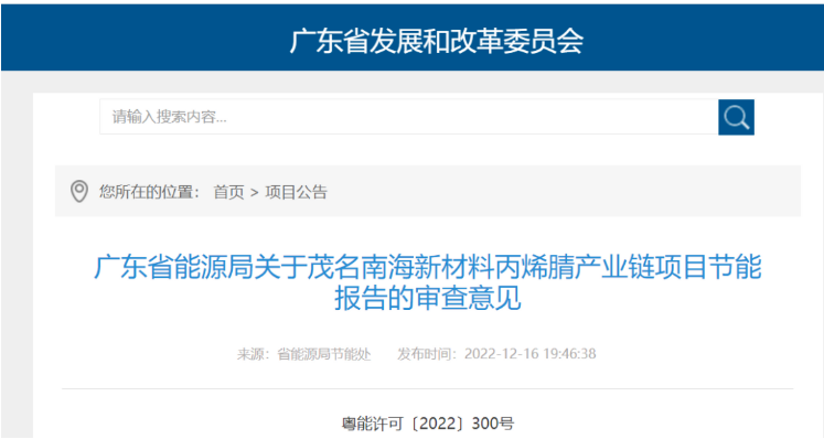 12月16日,广东省发改委公布了关于茂名南海新材料丙烯腈产业链项目节能报告的审查意见。