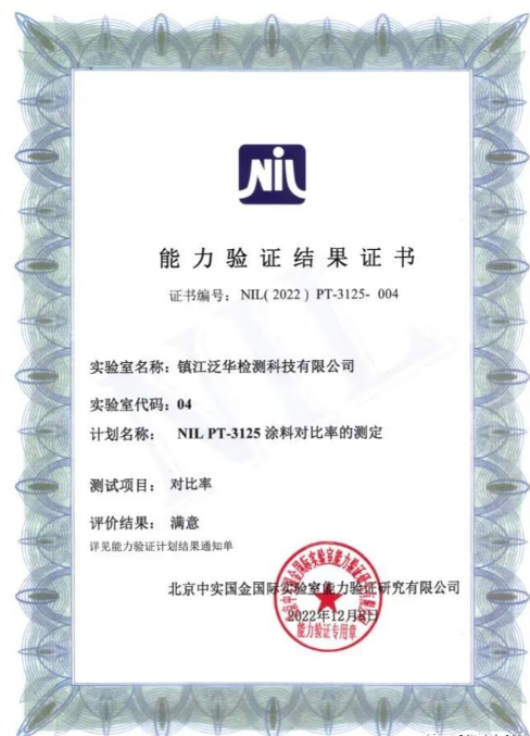 近日,镇江泛华检测科技有限公司通过了由北京中实国金国际实验室能力验证研究公司组织的本年度NIL-PT-3125“涂料对比率的测定”能力验证,顺利获得了“能力验证满意证书”。