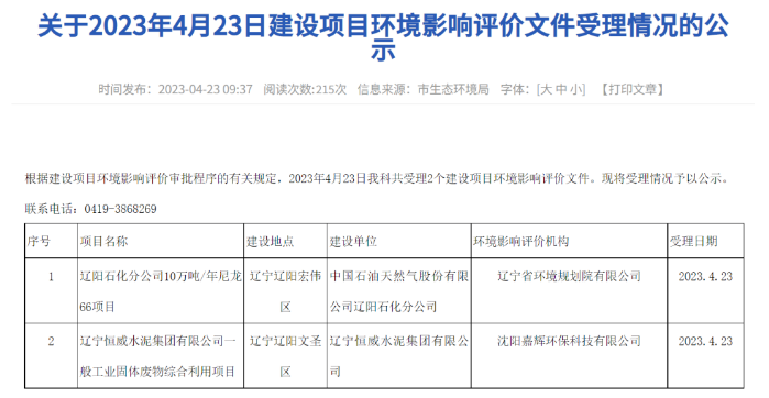 近日,辽阳市生态环境局受理公示两个项目,其中包括辽阳石化分公司10万吨/年尼龙66项目。