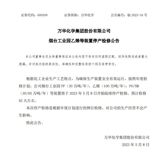 5月8日,万华化学发布公告称,根据化工企业生产工艺特点,为确保生产装置安全有效运行,按照年度检修计划,公司烟台工业园PP(30万吨/年)、乙烯(100万吨/年)、PO/SM(30/65万吨/年)等装置将于5月8日开始陆续停产检修,预计检修45天左右。