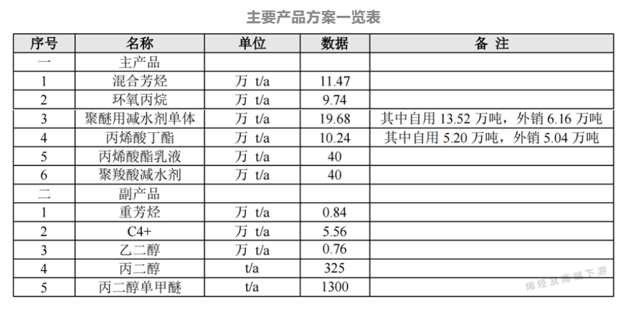 建设内容:项目建设内容主要包括40万吨/年DMTA装置、20万吨/年环氧乙烷装置、20万吨/年聚醚减水剂大单体、40万吨/年聚羧酸减水剂装置、25万吨/年双氧水装置(折27.5%浓度)、10万吨/年环氧丙烷装置、8万吨/年丙烯酸装置、12万吨/年丙烯酸丁酯装置、40万吨/年丙烯酸乳液装置以及配套的公辅装置。