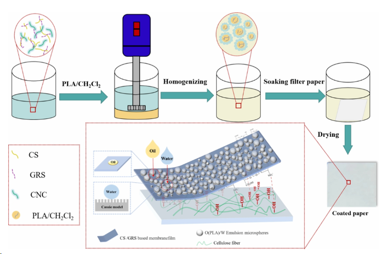 为开发应用广泛的纸基食品包装材料,华南农业大学材料与能源学院生物基功能高分子材料研究团队开发了基于纤维素纳米晶、聚乳酸、壳聚糖、糯米淀粉构建的生物基皮克林乳液涂料,通过在纸表面一步涂层便捷有效的构建了疏水阻油的涂层纸,优化后的涂层纸不仅具有良好的疏水阻油性、增强的力学性能,还具有防污自清洁性、可生物降解性、便捷回收性及再加工性,在食品包装领域展现出良好的应用潜力。相关研究成果以“Facile preparation of Pickering emulsion-based coatings for hydrophobic, oil-resistant, biodegradable green paper-based packaging”为题在国际知名期刊《Food Hydrocolloids》(中科院一区Top,IF 2023 = 10.7)上发表,论文的第一作者为团队2021级硕士研究生彭影影,通讯作者为胡洋副教授、杨卓鸿教授,该研究得到了广东省科技计划、顺德区科技计划和中国博士后科学基金等项目的支持。该研究将皮克林乳液与全生物基涂料相结合,为制备疏水、阻油、可重复使用的多功能包装纸提供了一种绿色、可持续、低成本的策略。