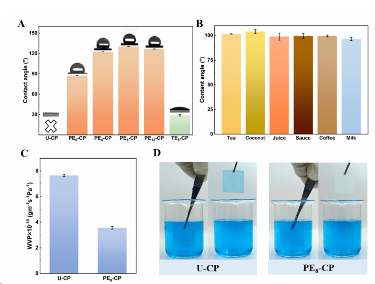图3 (A) 原始纸(U-CP)和涂层纸的WCA测试结果;(B)PE8-CP纸表面上各种液体的接触角;(C)U-CP和PE8-CP纸的水蒸透过率结果;(D)U-CP和PE8-CP纸的防污测试。