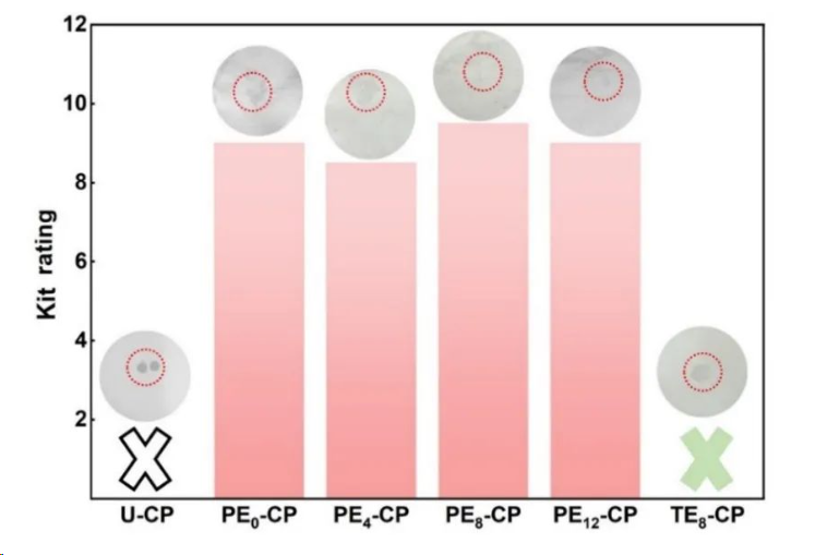 图4 原始纸和涂层纸的防油等级测试结果。