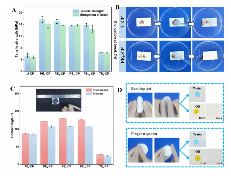 图6 (A) 原始纸和涂层纸的机械性能;(B)U-CP和PE8-CP纸的自清洁性能(泥土作为模型污垢剂);(C)PE8-CP纸在机械磨损测试前后的WCA值;(D)PE8-CP纸在50次弯曲和手指擦拭测试后疏水防油的照片。