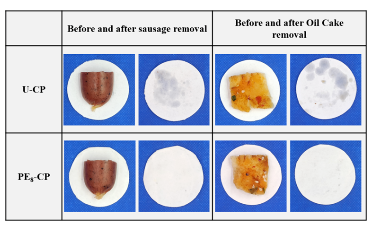 图5 将香肠和油饼分别放在原始纸和涂层纸上进行耐油性实验(食物放在纸上30分钟后取出观察纸面渗油情况)。